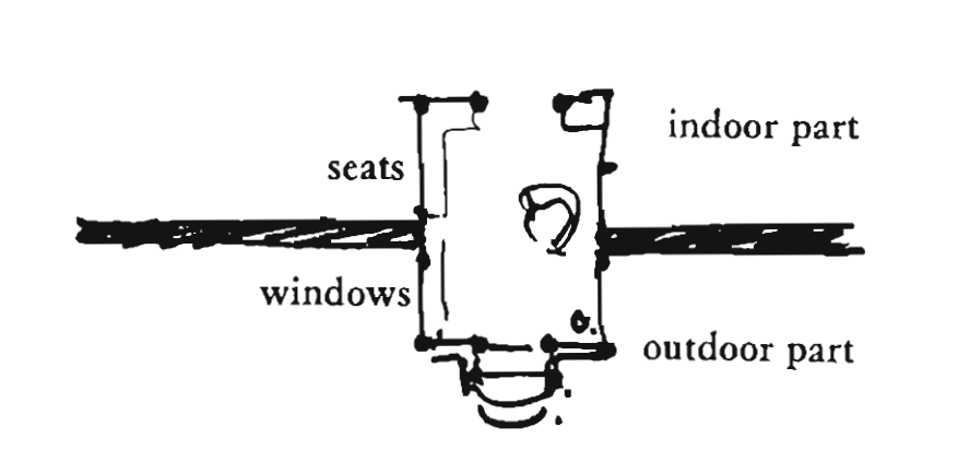 The subtleties of saying goodbye: When hosts and guests are saying goodbye, the lack of a clearly marked “goodbye” point can easily lead to endless “well, we really must be going now,” and then further conversations lingering on, over and over again. Once they have finally decided to go, people try to leave without hesitation. People try to make their goodbye as non-abrupt as possible and seek a comfortable break. Give the entrance room, therefore, a clearly defined area, at least 20 square feet, outside the front door, raised with a natural threshold – perhaps a railing, or a low wall, or a step – between it and the visitors’ cars.