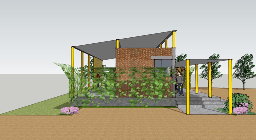 This design is a north facing 325 sq ft brick box with a double roof – the extra steel canopy shades the building and verandahs all around. Jali walls on the west side provide spaces to sit while also protecting the house from evening sun.