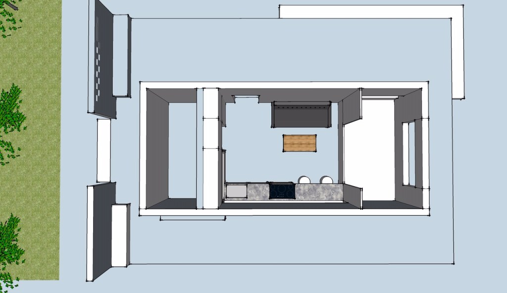 The bedroom floor height is now raised by 8 inches to distinctly separate it from the living space. This also has the advantage of reduced ceiling height and therefore, make the space feel more private and cozy. Storage wall is now planned between bed alcove and main space. It will provide wardrobe storage for the bedside and kitchen cabinets the other side, while also functioning as an internal wall. A workspace table is added with a window view into the farm.