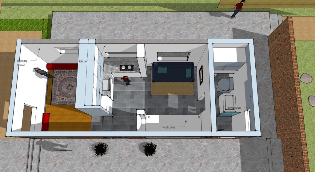 There is a bed alcove facing east. The bathroom is the room towards the west and in between there would be a wall of storage. A kitchen bar/desk/ dining table runs the length of the main space.